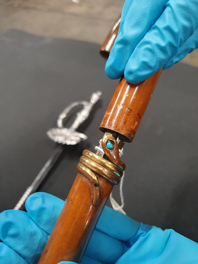 Marconi's Sword-Stick with cane handle and shaft, with gilt-metal band in the form of a snake with a turquoise eye. Steel blade marked 'Non ti fidar di me se il cor ti manca' ('Trust not in me if your heart be faint'). With scabbard.