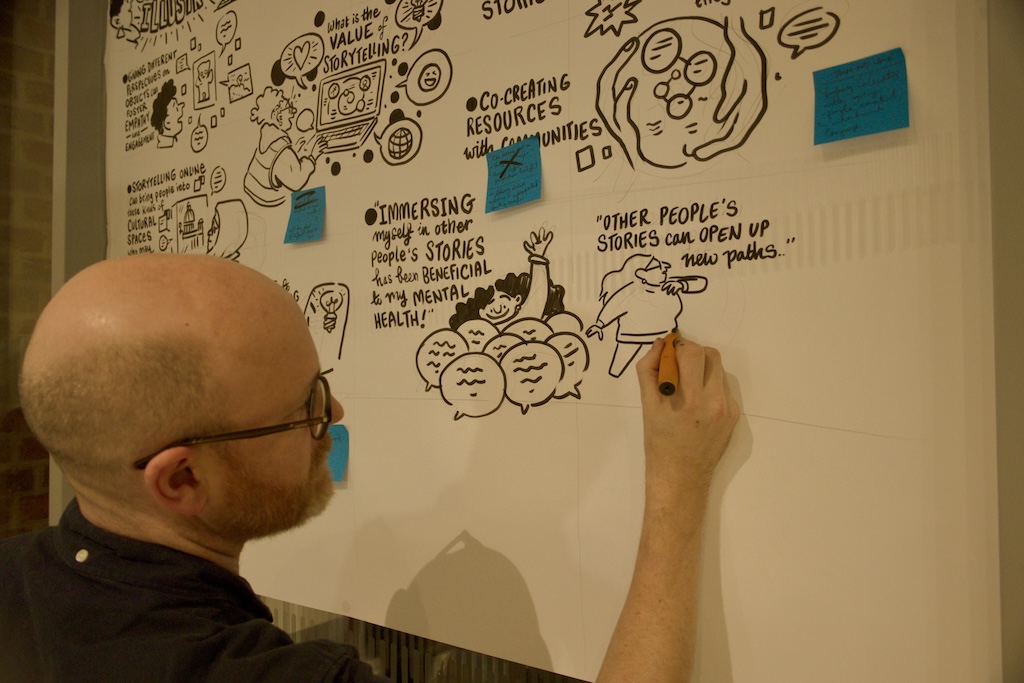 Explore the illustration by Jack Brougham capturing conversations and ideas relating to the power of storytelling.